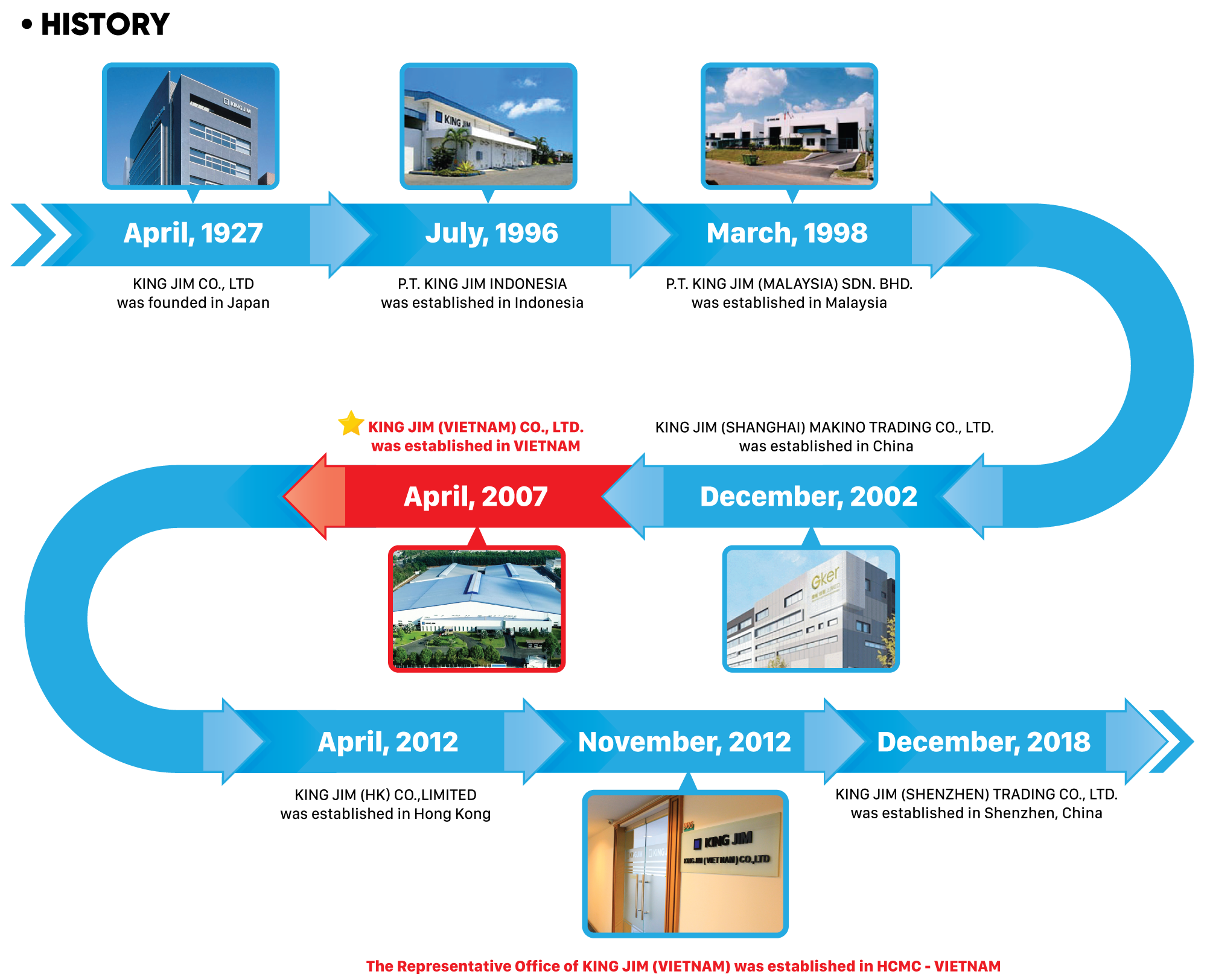 KING JIM CO., LTD. was founded in 1927 in Japan. With 97 years in operating and developing, KING JIM has become a favourite and successful brand not only in Japan but also in other countries. Currently, KING JIM GROUP has three factories in Vietnam, Indonesia, Malaysia and three Trading Companies in Hong Kong, Shanghai and Shenzhen and together with distributing systems all over the world.