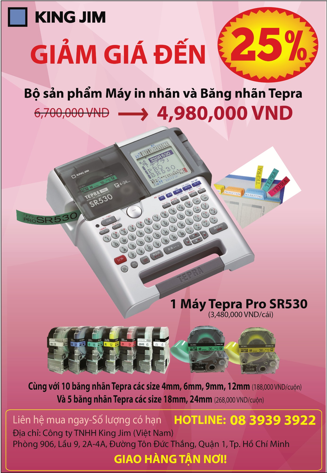When customers buy a package of 1 label printing machine Tepra Pro SR530 and 15 Tepra Tapes (10 tapes with sizes 4mm, 6mm, 9mm, 12mm and 5 tapes with sizes 18mm, 24mm), they will receive a discount up to 25%, from 6,700,000VND down to 4,980,000VND.