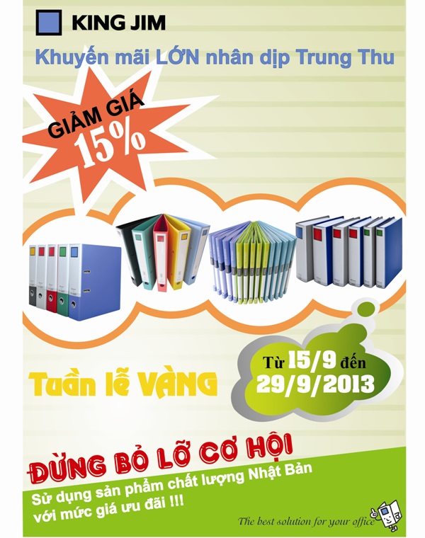 From the day King Jim (Viet Nam) start attending in stationary market. All customers believe and use King Jim products for good quality and nice design. Besides saying truthful thanks to our customers , to join exciting atmosphere in Mid- Autumn festival, King Jim (Viet Nam) are pleased to give to customers a very attracting promotion program “ King Jim (Viet Nam)- discount 15% for all kinds of file folders”.