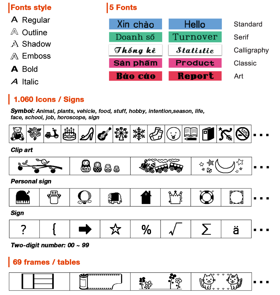 | Symbols & frames | 1,060 words và symbols, 69 frames/table, 6 fonts |