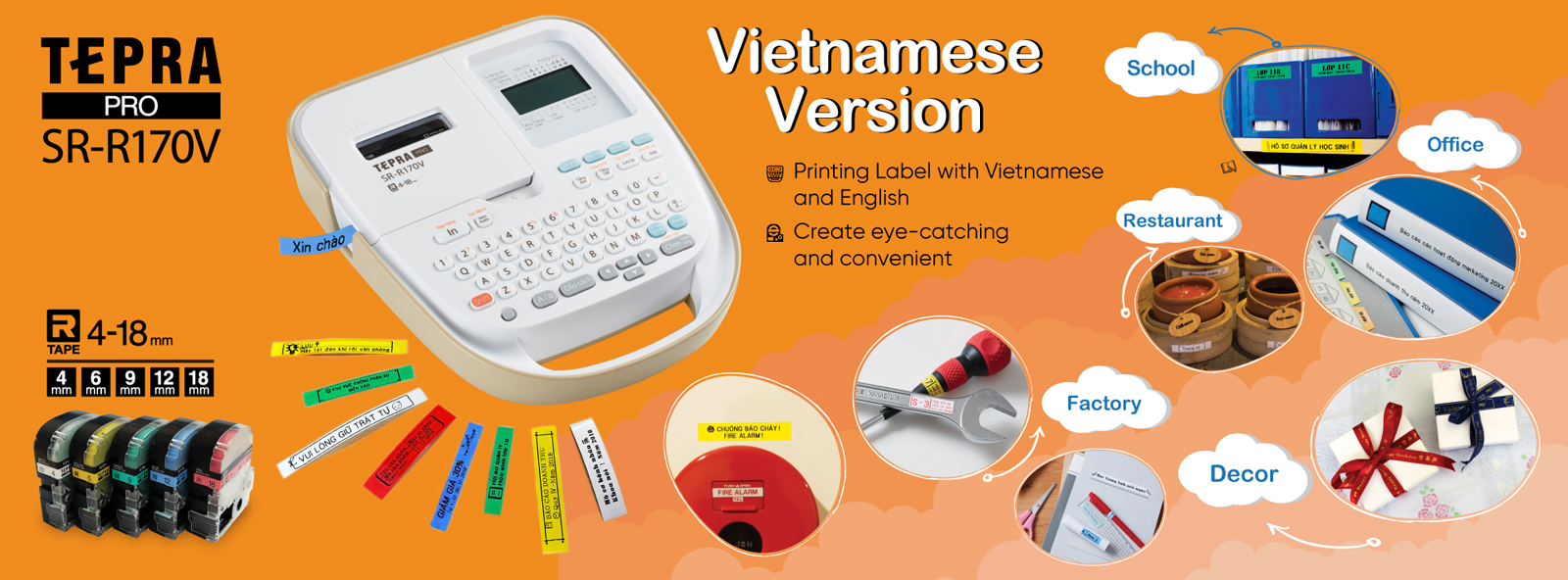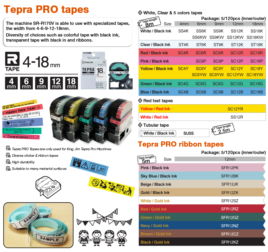 Tepra Pro SR-R170V - Vietnamese version The label printer is exclusively designed for users in Vietnam. You can easily type any message in Vietnamese in Telex/VNI code. With high mobility and ability to provide various application, SR-R170V is an indispensable partner to carry with when you need to decorate anything |
